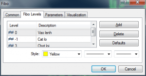 Đầu tiên, mở Fibonacci Retracement và đổi lại thông số như hình sau.