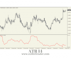 Chỉ báo ATR là chỉ báo đo lường sự biến động giá của đỉnh đáy trước đó. Chu kỳ 14 là cài đặt phổ biến với chỉ báo này. Khi ATR có giá trị cao nghĩa là thị trường đang biến biến động mạnh. Ngược lại, giá trị ATR thấp hơn thể hiện thị trường có mức biến động thấp. ATR cũng có thể được sử dụng như một dấu hiệu của sự đảo chiều.