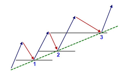 Như hình minh họa ở trên thì trong 1 xu hướng tăng giá giả sử đường xu hướng đã được thiết lập với các đáy cũ ở dưới và hiện tại đang tiếp tục tiếp diễn là nét đứt màu xanh lá cây, thì tại điểm 1 và 2 chỉ là các mức cản tâm lý (giá tiệm cận đường xu hướng nên tâm lý thị trường sẽ thiên về việc mua vào kỳ vọng giá đi lên), còn tại điểm 3 là sự hồi quy của cả mức cản tâm lý và cản kỹ thuật (giá vừa tiệm cận đường xu hướng, đồng thời nó là ngưỡng hỗ trợ cũ – là vùng giá ở đỉnh cũ). Như vậy khi sử dụng kẻ đường xu hướng nếu bạn chỉ giao dịch với những điểm như vùng giá số 3 thì xác suất chiến thắng là CAO HƠN HẲN so với vùng giá 1 và 2. Bởi vậy nếu sử dụng trendline thuần tùy mà không kết hợp nó với yếu tố CẢN KỸ THUẬT thì tính chính xác của nó là không cao như nhiều người kỳ vọng.