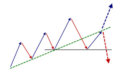 Sau khi giá phá vỡ đường xu hướng và hồi lên tiệm cận bên dưới đường xu hướng thì sẽ rất nhiều nhà đầu tư sẽ nghĩ rằng xu hướng đã đảo chiều và vào lệnh bán tại đây, và rất nhiều trường hợp giá sẽ tiếp tục tăng theo đường nét đứt màu xanh. Lưu ý rằng xu hướng chỉ thực sự thay đổi nếu giá chạy theo đường nét đứt màu đỏ, khi đó giá đã thiết lập 1 đỉnh mới thấp hơn và chắc chắn sẽ có 1 đáy mới thấp hơn (đủ 2 điều kiện đảo chiều xu hướng) vì giá đã phá vỡ vùng cản ở đường kẻ màu đen