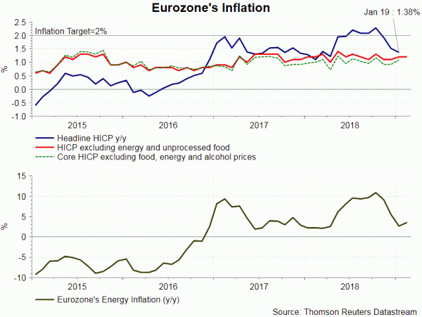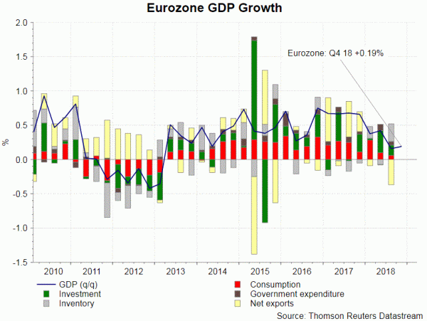 Kể từ cuộc họp tháng 1, dữ liệu kinh tế tại Eurozone cho thấy sự chậm lại. Tăng trưởng GDP chỉ đạt + 0,19% so với quý trước trong quý 4/2018. Trong khi xuất khẩu ròng là lực cản chính, đóng góp từ tiêu dùng hộ gia đình và đầu tư vào tăng trưởng giảm đáng kể khi so sánh với quý trước. Theo quốc gia, Đức hầu như không tránh khỏi suy thoái kỹ thuật với mức tăng trưởng 0% trong quý 4/2018. Tuy nhiên, Ý đã suy thoái. Về lạm phát đã phục hồi lên + 1,5% so với cùng kỳ trong tháng 2, sau khi giảm mạnh + 1,38% so với cùng kỳ trong tháng 1. Trong khi lạm phát có thể không ổn định do giá dầu, CPI cơ bản, được cho là thước đo động lực giá cơ bản của nền kinh tế, đã giảm xuống + 1% so với năm ngoái, so với sự đồng thuận là + 1,1%. Tỷ lệ thất nghiệp không thay đổi ở mức 7,8%, so với sự đồng thuận. Đó là mức thấp nhất kể từ tháng 10 năm 2008. Tuy nhiên, tình hình việc làm được chuyển hướng ở các quốc gia thành viên khác nhau. Chẳng hạn, Hy Lạp và Tây Ban Nha vẫn đang nắm giữ tỷ lệ thất nghiệp hai con số.
