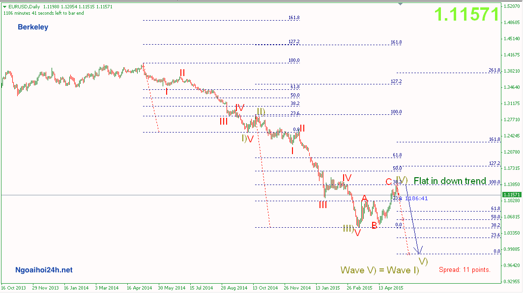 Dưới đây là chart Daily của EURUSD. Theo tôi thì trong tuần vừa qua EURUSD đã hoàn thiện sóng IV ( Sóng IV chạy theo mô hình Flat). Wave IV = 38,2% Wave III.
