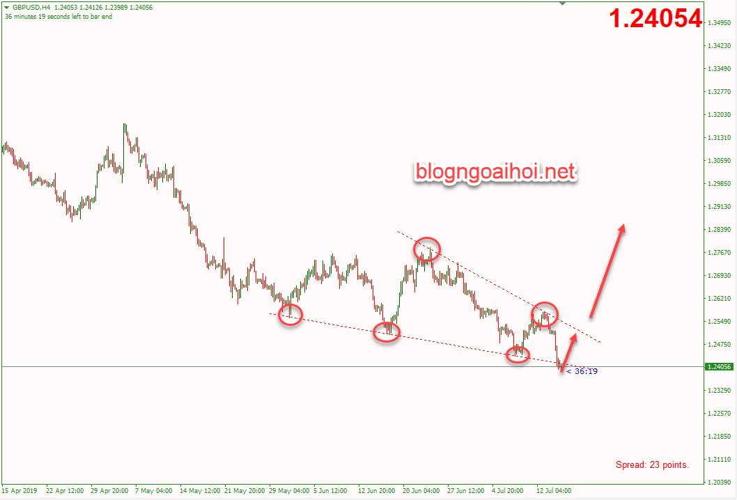 Về góc kỹ thuật : Trong lần cập nhật trước, chúng tôi có đề cập đến mô hình nêm giảm-Falling wedge và cho rằng GBPUSD giảm về lại vùng đáy cũ dưới 1.245. Và GBPUSD đã giảm xuống 1.24 vào hôm qua. Biểu đồ dưới đây được sử dụng cho lần cập nhật đó.