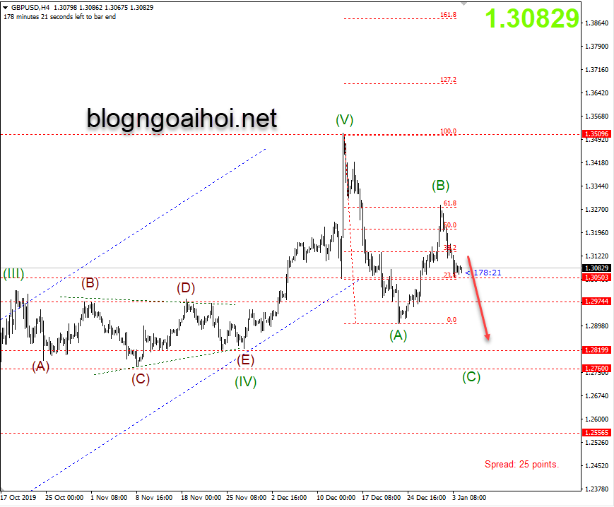 Về góc kỹ thuật : Trong lần cập nhật trước, chúng tôi có đề cập đến vùng bán ở quanh 1.328 với việc kỳ vọng sóng (B) hoàn tất ở mức Fib 61.8%. Thực tế GBPUSD đã giảm khá tốt ở vùng giá này. Biểu đồ dưới đây được sử dụng cho lần cập nhật trước.