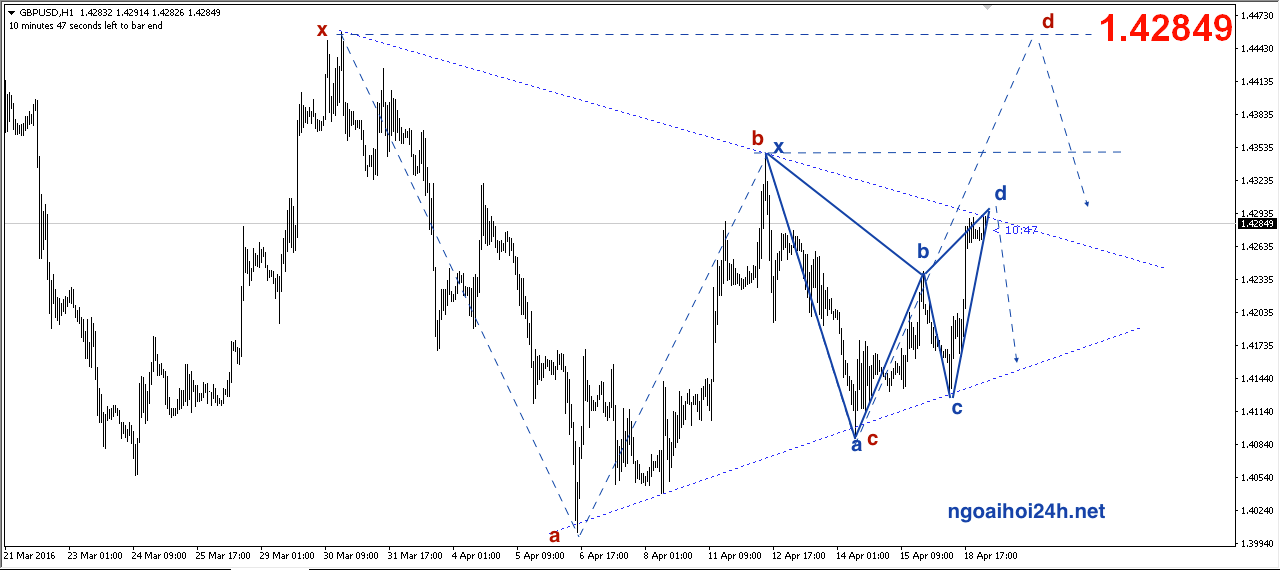 Nếu giá đi lên thẳng luôn, thì vùng đỉnh cũ 1.444x có thể sẽ giúp cặp tiền này hạ nhiệt, khi ở đây hình thành mô hình ” Bearish gartley” (xabcd) cho giảm điểm.
