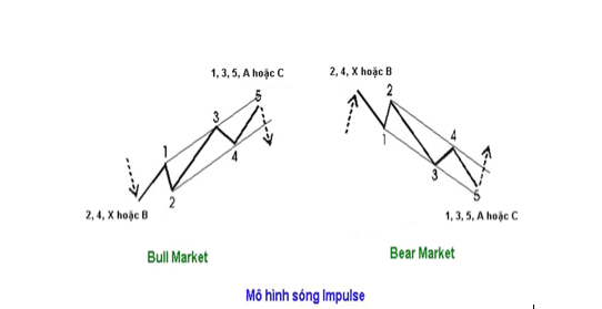 Mô hình Impulse xuất hiện ở các sóng 1,3,5 và các sóng A, C thuộc quá trình điều chỉnh (Correction). Mô hình này còn xuất hiện trong các quá trình điều chỉnh tại các sóng 2, 4, X hoặc B.