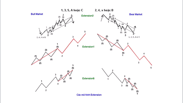 2. Mô tả:Mô hình sóng Extension (mô hình sóng mở rộng) xảy ra trong một sóng chủ nơi mà các sóng 1, 3 hoặc 5 có thể mở rộng và kéo dài hơn các sóng khác. Mô hình mở rộng phổ biến nhất là mở rộng sóng 3 và khi đó hai sóng 1, 5 có xu thế bằng nhau; mô hình này có tên gọi là Extension3. Nếu sóng 1 mở rộng thì có tên gọi là Extension1, nếu sóng 5 mở rộng thì có tên gọi là Extension5; hai mô hình này ít phổ biến hơn mô hình Extension3. Ở đây chỉ giới thiệu sâu hơn về mô hình Extension3.3. Quy tắc: (1) Mô hình Extension3: