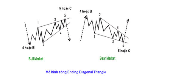 2. Mô tả:Mô hình sóng Ending Diagonal Triangle thuộc dạng mô hình sóng chủ thường xảy ra ở các sóng cuối một cấp độ sóng như sóng 5 hay sóng C. Không nên nhầm lẫn nó với các mô hình tam giác điều chỉnh.Mô hình sóng Ending Diagonal Triangle là hiện tượng tương đối hiếm đối với các cấp độ sóng lớn mà thường xuất hiện ở các cấp độ sóng thấp hơn trên các đồ thị giá trong ngày (intraday). Thường thì theo sau mô hình Diagonal Triangle là sự thay đổi mạnh về xu hướng thị trường.3. Quy tắc: