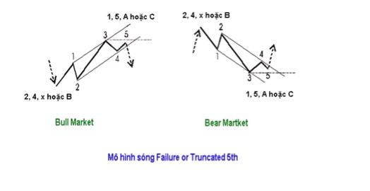 2. Mô tả:Mô hình sóng Failure or Truncated 5th (mô hình sóng chủ thất bại tại sóng 5 – hay sóng 5 cụt) thuộc dạng mô hình sóng chủ mà sóng 5 không vượt qua được sóng 3. Sóng 5 chỉ đến gần đỉnh sóng 3. Mô hình này cho thấy xu hướng yếu và thị trường sẽ nhanh chóng chuyển hướng theo xu hướng ngược lại.3. Quy tắc: – Mô hình Failure or Truncated 5th bao gồm 5 sóng.– Sóng 2 không dài hơn về khoảng cách giá so với Sóng 1 vì thế sẽ không vượt qua điểm khởi nguồn của Sóng 1.