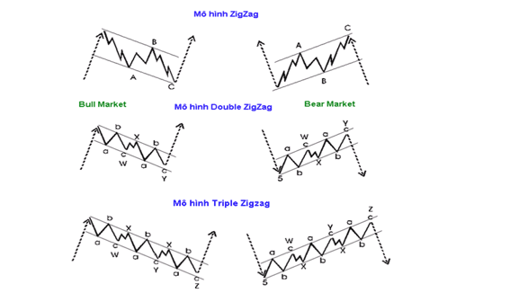 Mô hình ZigZag đơn (Single ZigZag) gồm 3 sóng. Mô hình Double ZigZag gồm 7 sóng được chia tách bằng sóng X ở giữa. Mô hình Triple ZigZag gồm 11 sóng được chia tách bằng 2 sóng X ở giữa. Cấu trúc bên trong của sóng 3 trong Single ZigZag là 5-3-5, trong Double ZigZag là 5-3-5-3-5-3-5.