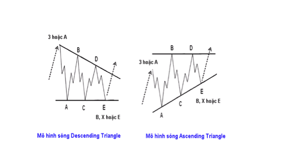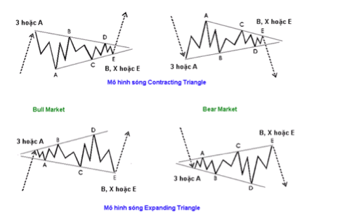 – Trong mô hình sóng Contracting Triangle thì Sóng A là sóng dài nhất và Sóng E là sóng ngắn nhất. Trong mô hình sóng Expanding Triangle thì Sóng A là sóng ngắn nhất và Sóng E là sóng dài nhất.