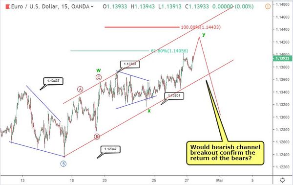 Đường double zigzag nằm trên sóng y nên là chân cuối cùng. Phạm vi của chặng cuối không chắc chắn lắm nhưng sử dụng các công cụ kỹ thuật, chúng ta có thể thiết kế các vùng đảo chiều có thể. Phần mở rộng Fibonacci của sóng w từ x là 100% tại 1.1443. Điều này có nghĩa là 1.14-1.1443 là vùng đảo ngược của chúng tôi. Giá sẽ được dự kiến sẽ đảo ngược ở bất kỳ giá nào trong khu vực này và phá vỡ dưới kênh tăng double zigzag để xác nhận cam kết của nó đối với nhược điểm. Một sự bứt phá nhanh chóng trên khu vực này đến 1.15 sẽ làm mất hiệu lực dự báo này và thấy chúng tôi có một diện mạo mới trong bản cập nhật phân tích sóng EURUSD hàng ngày tiếp theo của chúng tôi.