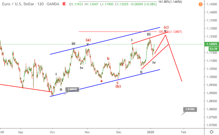 Giá EURUSD đã di chuyển ổn định khoảng 1,12 kể từ tháng 12. Sự phục hồi hiện tại sẽ vượt qua ngưỡng kháng cự trong ngày 1.1238. Tuy nhiên, dường như có một rào cản giữa 1.128 và 1.13 với mô hình giảm giá đảo chiều đang nổi lên. Trong bản cập nhật mới nhất , chúng tôi đã xem xét cuộc tăng giá từ 1.088 hoàn thành mô hình zigzag tăng điều chỉnh. Chúng tôi đã sử dụng biểu đồ bên dưới.