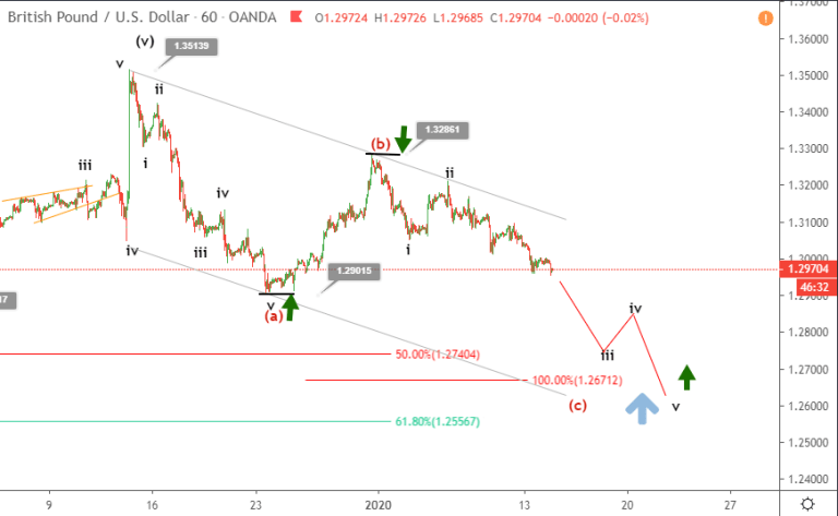 Sau khi hoàn thành một làn sóng thúc đẩy ở mức 1.3515, giá GBPUSD đang thực hiện điều chỉnh giảm 3 sóng. Đây là quy tắc sóng Elliott cơ bản. Việc điều chỉnh giảm 3 sóng đang hoàn thành mô hình zigzag đơn giản. Làn sóng (a) kết thúc lúc 1.29 vào tháng 12. Sóng (b) kết thúc lúc 1.3286 vào ngày 31 tháng 12. Sóng (c) đã bắt đầu. Trong bản cập nhật mới nhất , chúng tôi đã sử dụng biểu đồ bên dưới để minh họa cách sóng (c) có thể đi.