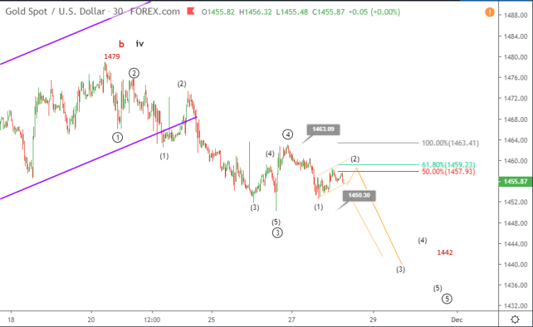 Phân tích sóng Vàng 28/11- Giá vàng ổn định trên 1450 sau hai lần thất bại để phá vỡ dưới nó. Phân tích sóng Gold Elliott sau đây xem xét những gì có thể xảy ra tiếp theo.