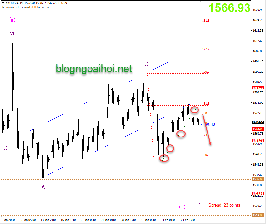 Vàng thế giới sau khi phá vỡ kênh giá tăng thì đã quay lại test kênh giá bị gãy và có sự suy giảm trở lại sau đó. Các chiến lược bán vàng ở quanh 1574-1576 của chúng tôi đã rất hiệu quả khi hôm qua vàng giảm xuống 1562. Biểu đồ dưới đây được sử dụng cho lần cập nhật trước.