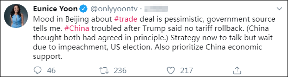 Sau khi phóng viên CNBC phát hành Twitter, ác cảm rủi ro tăng mạnh. Quan điểm của Bắc Kinh về các hiệp định thương mại là bi quan. Trung Quốc bối rối, đặc biệt là sau khi Trump nói rằng thuế quan sẽ không được hạ xuống. Chiến lược hiện tại của Trung Quốc là chờ đợi cuộc điều tra luận tội Trump và cuộc tổng tuyển cử Mỹ.