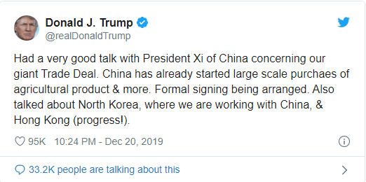 Tổng thống Hoa Kỳ Donald Trump cho biết vào cuối ngày thứ Sáu rằng ông đã có một cuộc nói chuyện rất tốt với Chủ tịch Trung Quốc Tập Cận Bình về Thỏa thuận Thương mại khổng lồ của chúng tôi. Ký kết chính thức của thỏa thuận đang được sắp xếp. Cả hai tổng thống cũng thảo luận về các vấn đề của Bắc Triều Tiên và Hồng Kông.