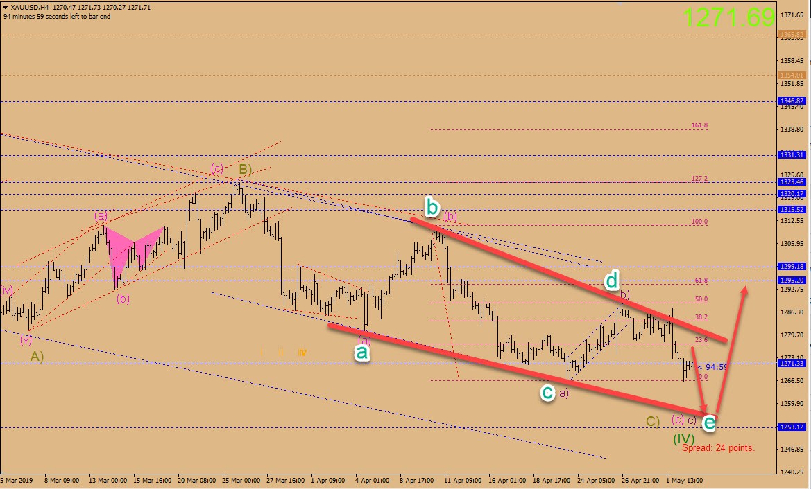 Vàng có thể tiếp tục giảm xuống để hoàn thiện nốt sóng c) của (IV) hoặc sóng (e) của C) của (IV). Chúng ta có thể chờ tín hiệu mua khi giá tiếp cận 1260.