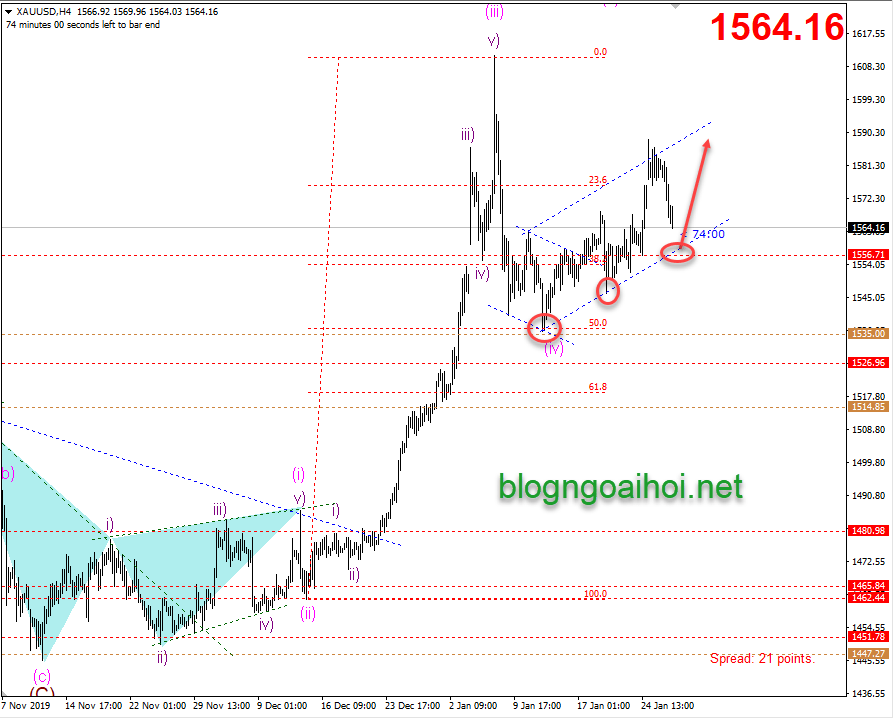 Vùng mua quanh 1560 hôm qua rất tiếc là đã không khớp. Vàng chỉ về quanh 1563 và bật tăng lên trở lại. Biểu đồ dưới đây được sử dụng cho lần cập nhật trước.