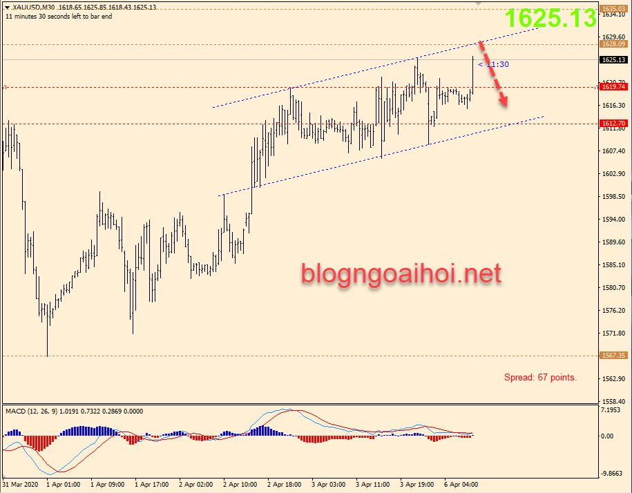 Chiến lược tham khảo : Vàng 6/4- Bán 1628-1630, Stop 1633, TP 1620-1615.