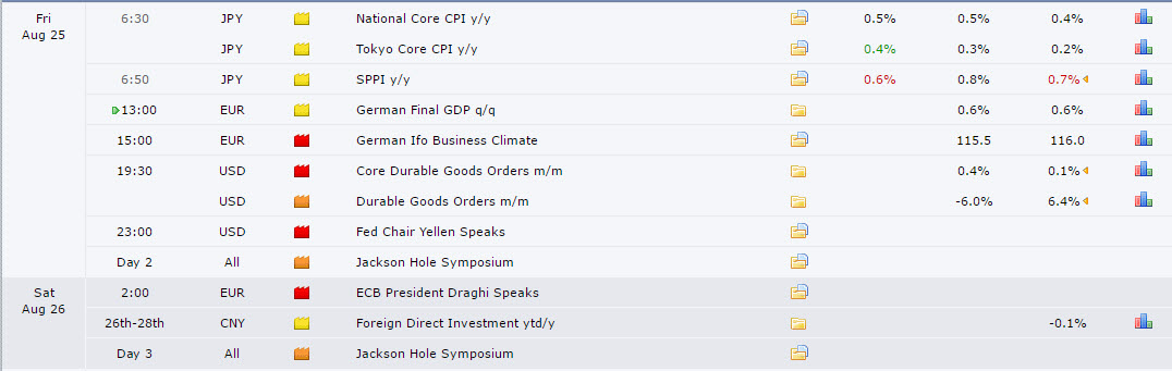 Nhìn vào tin tức cho ngày hôm nay, đầu tiên chúng ta sẽ chú ý đến tin hàng hóa lâu bền tháng của mỹ, sau đó thì đến 2 đại bàng yellen và Draghi phát biểu. Thị trường đang chờ đợi bài phát biểu của Chủ tịch Ngân hàng Trung ương châu Âu (ECB) Mario Draghi và Chủ tịch Fed Janet Yellen vào hôm nay tại hội nghị kéo dài 3 ngày tại Jackson Hole, bang Wyoming.