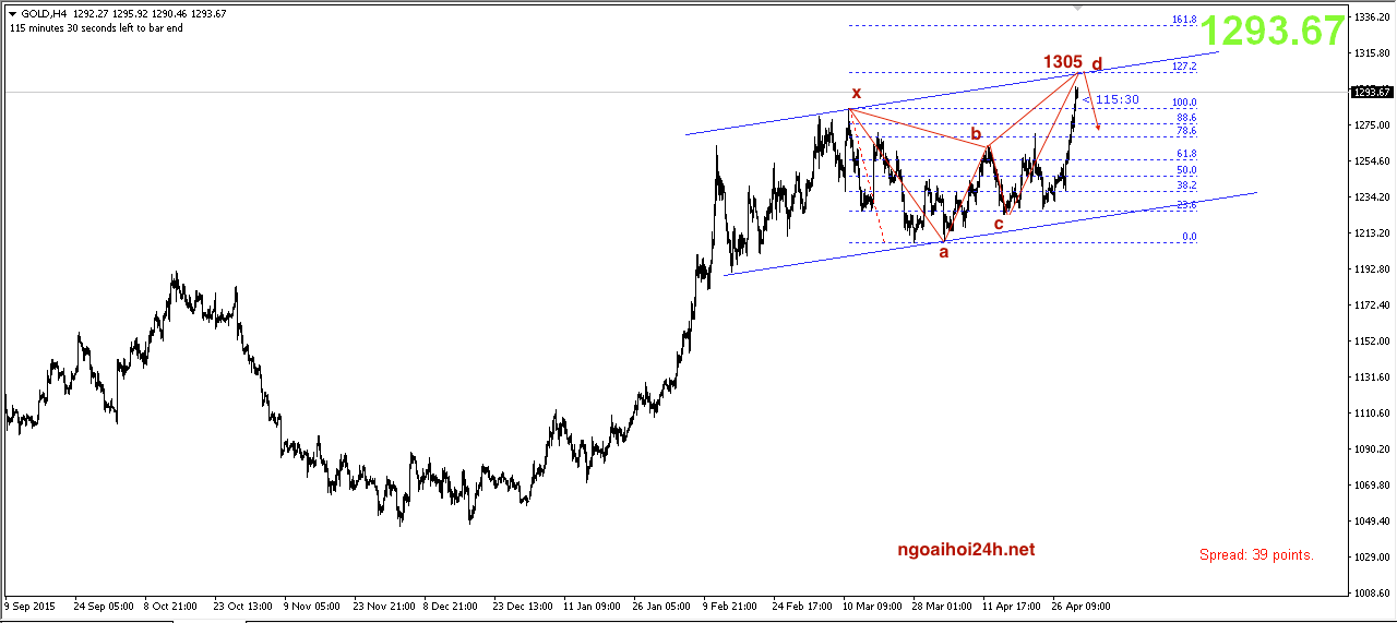 Mô hình harmonic ” Bearish butterfly” cũng cho dấu hiệu giá vàng hạ nhiệt ở quanh vùng 1305.