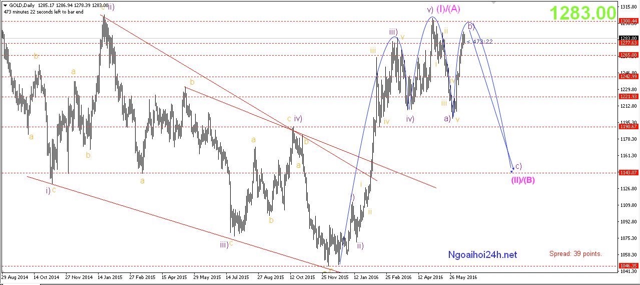 Trên D1 giá có thể đang hoàn thiện sóng b) của (II)/(B) cũng là vai phải của mô hình vai đầu vai quanh 1288-1290. Nếu giá vàng không phá đỉnh 1303 thì kịch bản chạy theo sóng c) để hoàn thiện nốt (II)/(B).