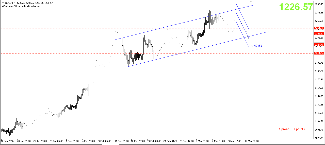 Giá vàng đã có dấu hiệu vỡ kênh tăng – Bullish channel, giá đã rơi về vùng hỗ trợ quanh 1222-1224. Việc giá phã vỡ kênh tăng, có thể làm cho giá vàng rơi thêm 1 đoạn nữa.