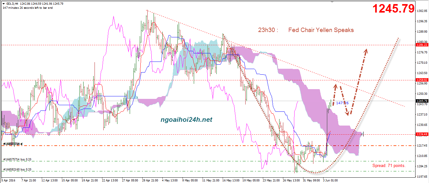 Hôm thứ 6, trên D1 chúng ta có thể thấy 1 cây nến tăng khá mạnh với biên độ gần 40usd, một ngày tăng bằng 4-5 ngày giảm trước đó. Cho thấy phe mua đang rất hưng phấn.