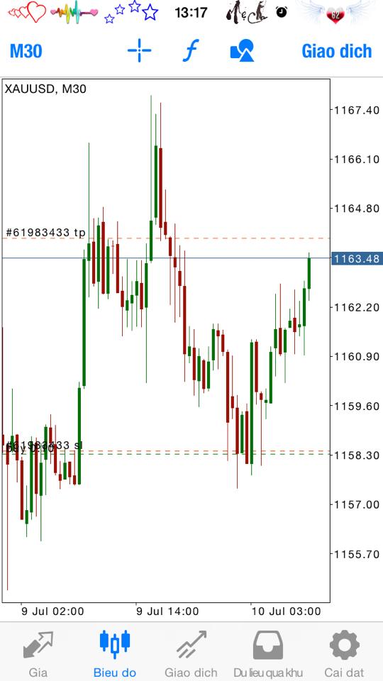 Hiện tại vàng đang gặp vùng kháng cự cứng, cũng là vai phải của mô hình vai- đầu- vai ở quanh 1164-1165. Do vậy tôi đã xử lý lệnh mua vàng lúc sáng ở 1163 .