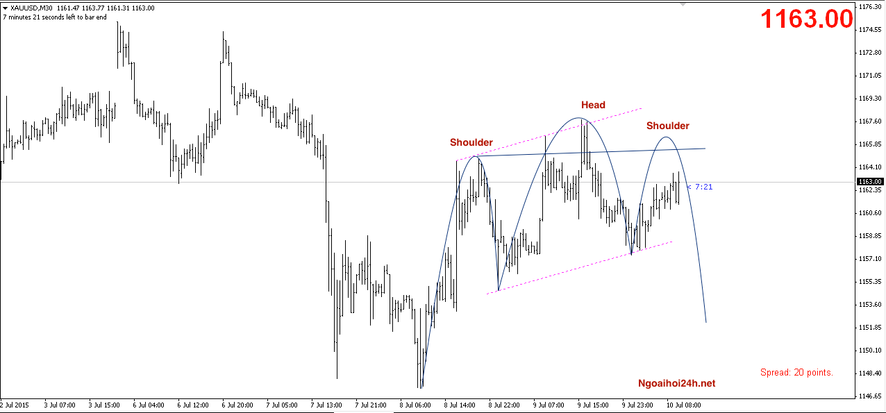 Giá vàng đã lên theo kịch bản ” Vàng chờ Fed phát biểu“. Tuy nhiên giờ trên chart M30 có dấu hiệu của mô hình vai – đầu- vai.