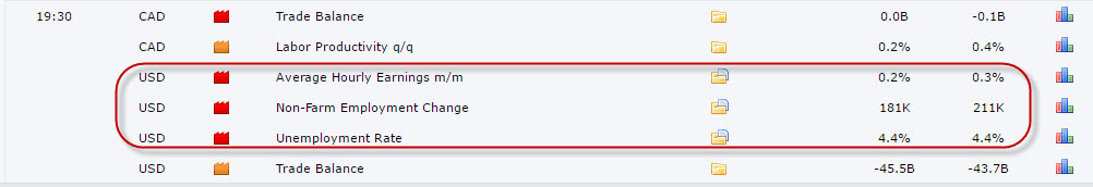 Bảng lương phi nông nghiệp – Non farm đang được dự báo là 181k xấu hơn so với kỳ trước là 211k . Tỷ lệ thất nghiệp được dự báo giữ nguyên ở 4.4%, thu nhập trung bình theo giờ cũng đang được dự báo xấu cho USD khi mà kỳ này chỉ là 0,2% thấp hơn kỳ trước 0.3%.
