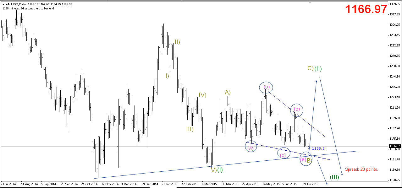 Giá đã xuống chạm vào biên dưới của tam giác, cũng hoàn tất sóng (e) của B). Nếu giá vàng không có dấu hiệu phá mạnh qua đáy ngày hôm qua tức 1157 hoặc trendline hỗ trợ phía dưới quanh 1150-1152 thì vàng có nhiều cơ hội tăng điểm trở lại theo kỹ thuật.