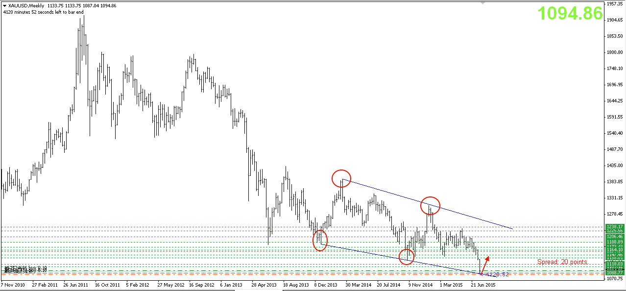 Trên chart W, giá vàng đang đi trong kênh giảm ” Bearish channel”. Giá đã xuống mức thấp nhất trong 5 năm qua, cũng là vùng biên dưới của kênh giảm. Nên khả năng có sự điều chỉnh lên nhẹ từ vùng này.