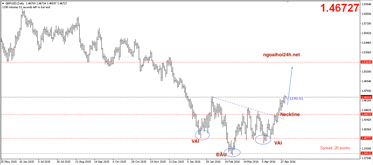 Ngoài ra các bạn cũng có thể tham khảo chart GBPUSD, khi cặp tiền này đang có dấu hiệu chạy theo mô hình vai đầu vai trên chart D1. Cặp tiền GBPUSD sẽ di chuyển lên tốt hơn nếu vỡ nốt vũng kháng cự 1.467x..