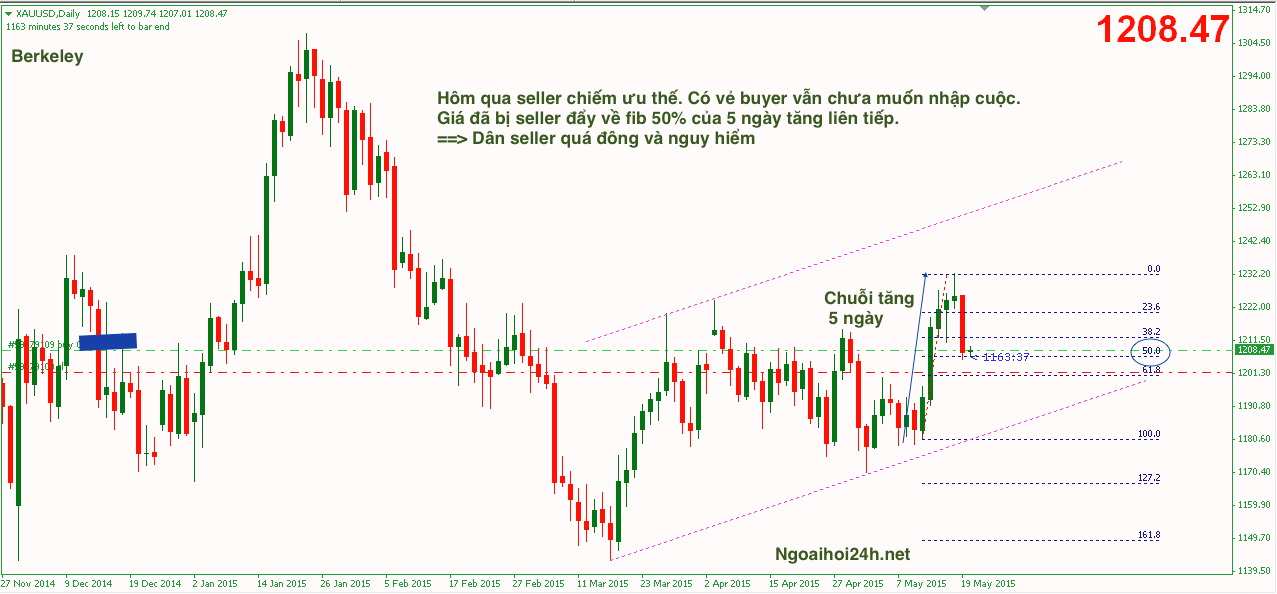 Ngày hôm qua thì giá vàng đã chấm dứt chuỗi tăng 5 ngày liên tiếp bằng 1 ngày giảm điểm khá mạnh khi rơi từ 1225 về 1206. Sau khi thị trường mỹ đón nhận tin ” Số nhà bắt đầu xây ” tại mỹ trong tháng 4 tăng lên cao nhất trong gần 7,5 năm.