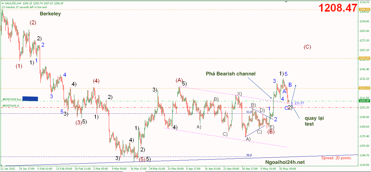 Tôi đã vào lệnh mua 1208 khi giá vàng test lại kênh gãy.