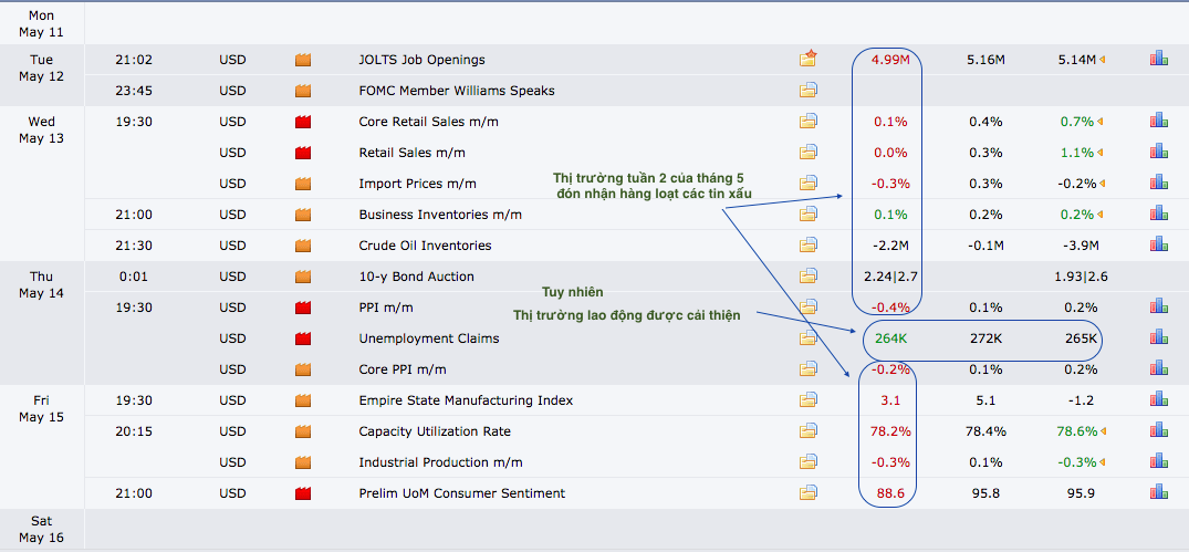 Phân tích vàng: Trong tuần vừa qua, vàng tiếp tục có tuần tăng điểm mạnh sau khi đón nhận hàng loạt các tin tức xấu. Một sắc đỏ trải dài trên bảng tin forexfactory. Các data yếu kém của Đại ca mỹ làm cho giới đầu tư bắt đầu hoài nghi về thời điểm tăng lãi suất của mỹ vào tháng 6 tới đây.