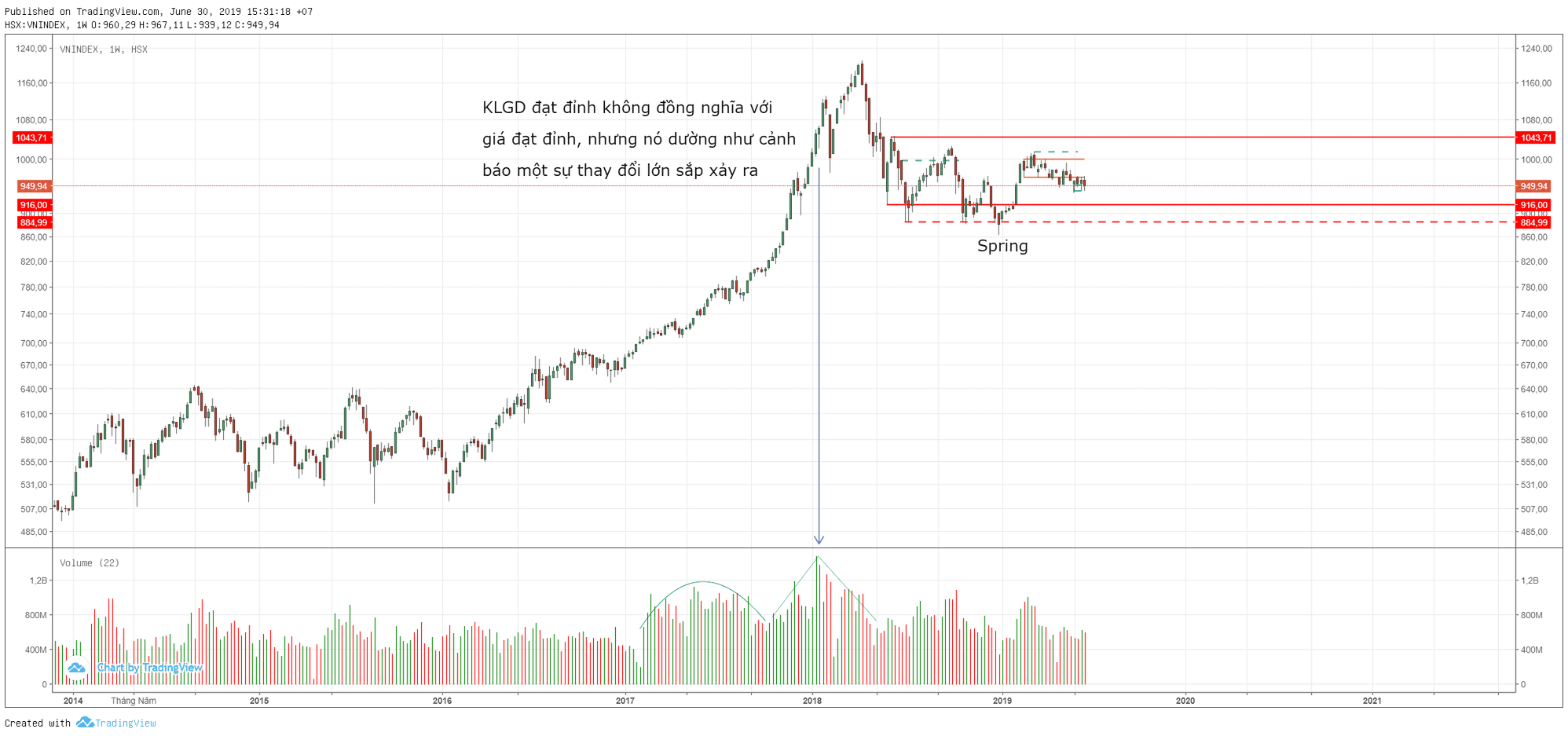 2. Thường xuyên chúng ta thấy 1 giai đoạn giá tăng rất mạnh hoặc giảm rất mạnh, ban đầu với KLGD thấp, sau đó đến một vùng giá nào đó thì KLGD lớn hơn rất nhiều và thậm chí xuất hiện những nến có KLGD đột biến gấp mấy lần trước đó, nhưng sau đó thì giá không còn duy trì được xu hướng nữa mà chuyển sang sideway.