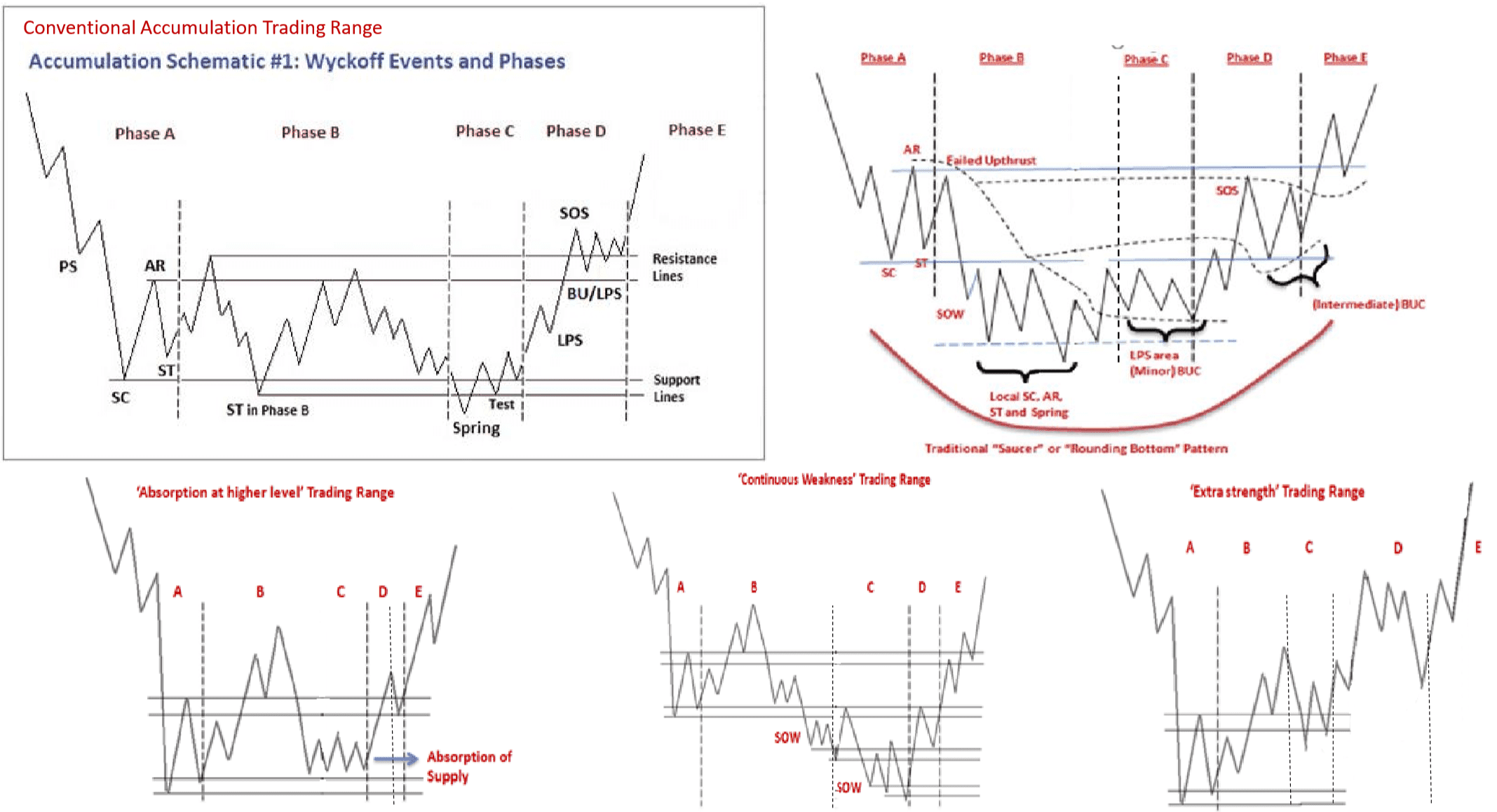 3. Có rất nhiều mô hình tích luỹ, cũng như phân phối, bảng dưới đây sẽ giúp các bạn có cái nhìn tổng quan về các mô hình thường gặp của chúng, diễn giải theo PP Wyckoff: