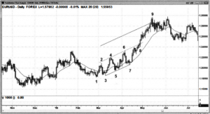 Trong chart này, bạn sẽ thấy nến số 7 xác nhận dạng xu hướng di chuyển theo hình bậc thang vì nó là lần giảm thứ 3 của thị trường (sau lần giảm thứ 2 và thứ 3 trước đó lần lượt tại nến số 5 và nến số 3).