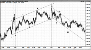 Chart này là một xu hướng tăng di chuyển theo hình bậc thang với 3 lần giá đẩy tại các nến 4, nến 6 và nến 8. Giá chỉ đảo chiều khi breakout được đường trend line tại nến số 9 (breakout và retest). Kể từ lúc đảo chiều, thị trường lại tiếp tục hình thành kênh giá mới.