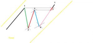 Hình 3: Chúng ta thấy, xu hướng 4 quay đầu tăng ngược trở lại phá vỡ điểm bắt đầu xu hướng 2 và xu hướng điều chỉnh thứ 2 khiến cho xu hướng chính tiếp diễn, nên thực tế các xu hướng nhỏ này sẽ thuộc xu hướng chính.
