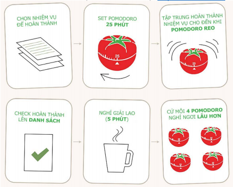 Quy tắc 25-5 : Tập trung cao độ để làm việc (hoặc học tập) trong thời gian 25 phút sau đó nghỉ ngắn 5 phút, và lại bắt đầu 1 phiên mới. Mỗi phiên như vậy gọi là 1 Pomodoro.