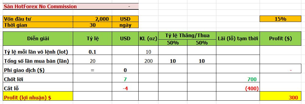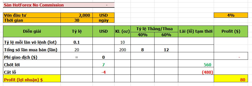 Bạn đầu tư với số vốn ban đầu = 2.000$ (hai ngàn đô) thời gian là 1 tháng, Bạn giao dịch tại sàn no commission. Bạn giao dịch theo 1 nguyên tắc cố định là cắt lỗ = 4 giá($), chốt lời = 7 giá($), một tháng bạn vào lệnh 20 lệnh tỉ lệ vào lệnh cho mỗi lần = 0.1 lot (tương đương = 10Zo vàng).