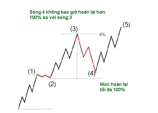 – Quy tắc 2: Sóng 4 không bao giờ hoàn lại 100% so với sóng 3. Nói cách khác, sóng 4 không nên vượt qua điểm khởi đầu sóng 3.