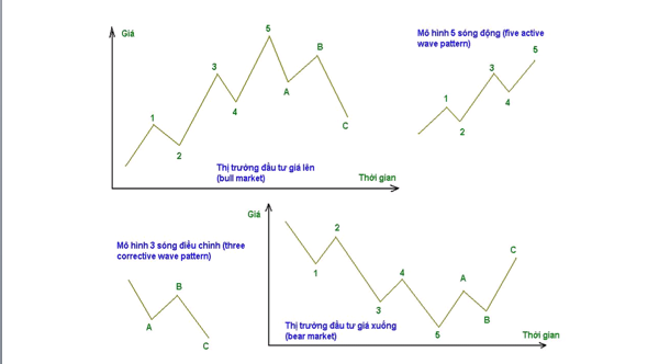 Trong đó một mô hình sóng cơ bản sẽ có 5 sóng chủ (impulsive Sóng) được đánh số theo số đếm 1-2-3-4-5 và 3 sóng điều chỉnh (corrective Sóng) được đánh số theo chữ cái A-B-C. Trong 5 sóng chủ thì sóng số 1, 3 và số 5 gọi là sóng “chủ và động” (motive Sóng), và sóng 2, 4 gọi là sóng “chủ và điều chỉnh” (corrective Sóng). Trong mỗi một con sóng như vậy lại có những con sóng nhỏ và cũng tuân theo quy luật của lý thuyết sóng Elliot. Một đợt sóng chủ hòan chỉnh sẽ có 89 sóng và đợt sóng điều chỉnh hoàn chỉnh sẽ có 55 sóng.