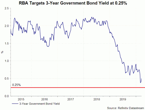 Ngân hàng trung ương cũng đưa ra kế hoạch kiểm soát đường cong lợi suất, nhắm đến lợi suất trái phiếu Chính phủ Úc 3 năm khoảng 0,25%. Theo ngân hàng trung ương, mục tiêu sẽ đạt được thông qua việc mua trái phiếu chính phủ và chứng khoán bán chính phủ trên đường cong lợi suất.