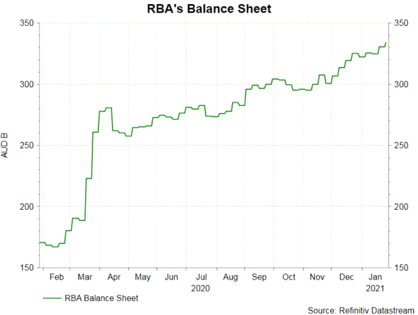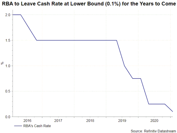 Trong tương lai, chúng tôi kỳ vọng RBA sẽ duy trì chính sách tiền tệ phù hợp trong những năm tới với việc cắt giảm và tăng lãi suất chỉ được thực hiện rất dần dần. Chúng tôi hy vọng các nhà hoạch định chính sách sẽ gia hạn việc mua tài sản trị giá 100B AUD thêm 6 tháng, khi chương trình hiện tại kết thúc vào tháng Năm. Mục tiêu kiểm soát đường cong lợi suất (YCC) lợi suất 3 năm ở mức 0,1% cũng sẽ tiếp tục trong cả năm. Có thể được xem xét vào năm 2022.